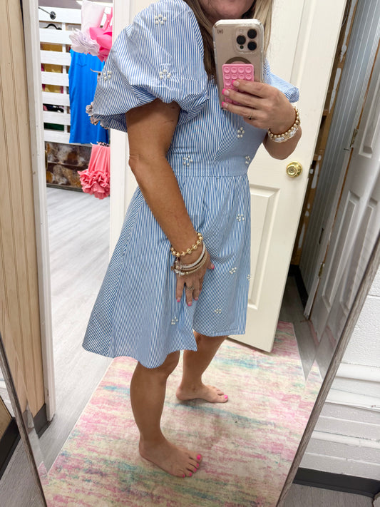 Women’s Peach Love Blue & White Striped With Pearls Dress