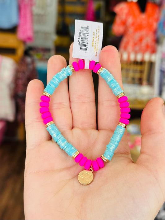 KK Jane Marie Pink, Tq Beaded Stretch Bracelet with Gold Spacers