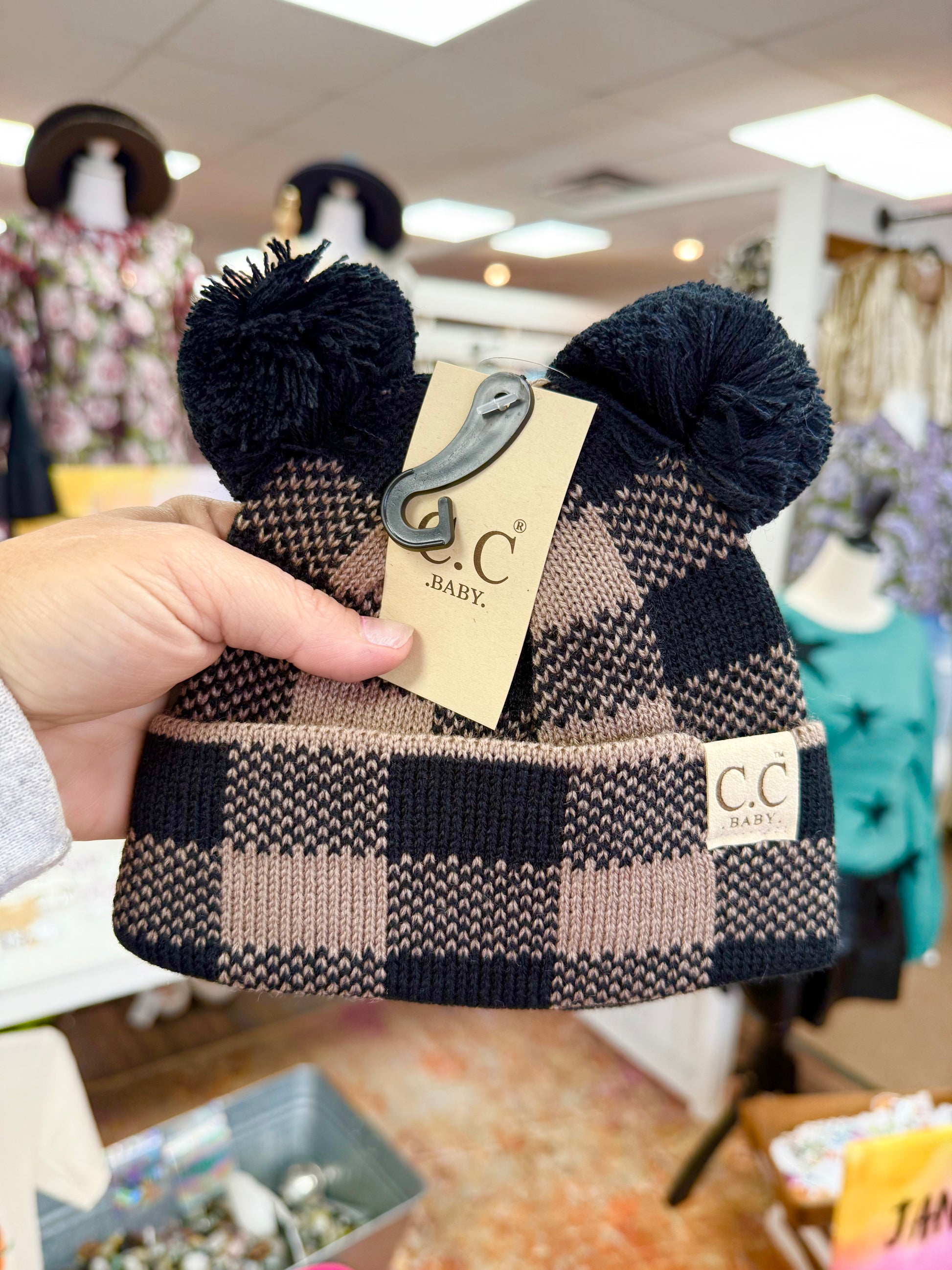 Baby Black/Taupe Plaid Pom Pom Beanie