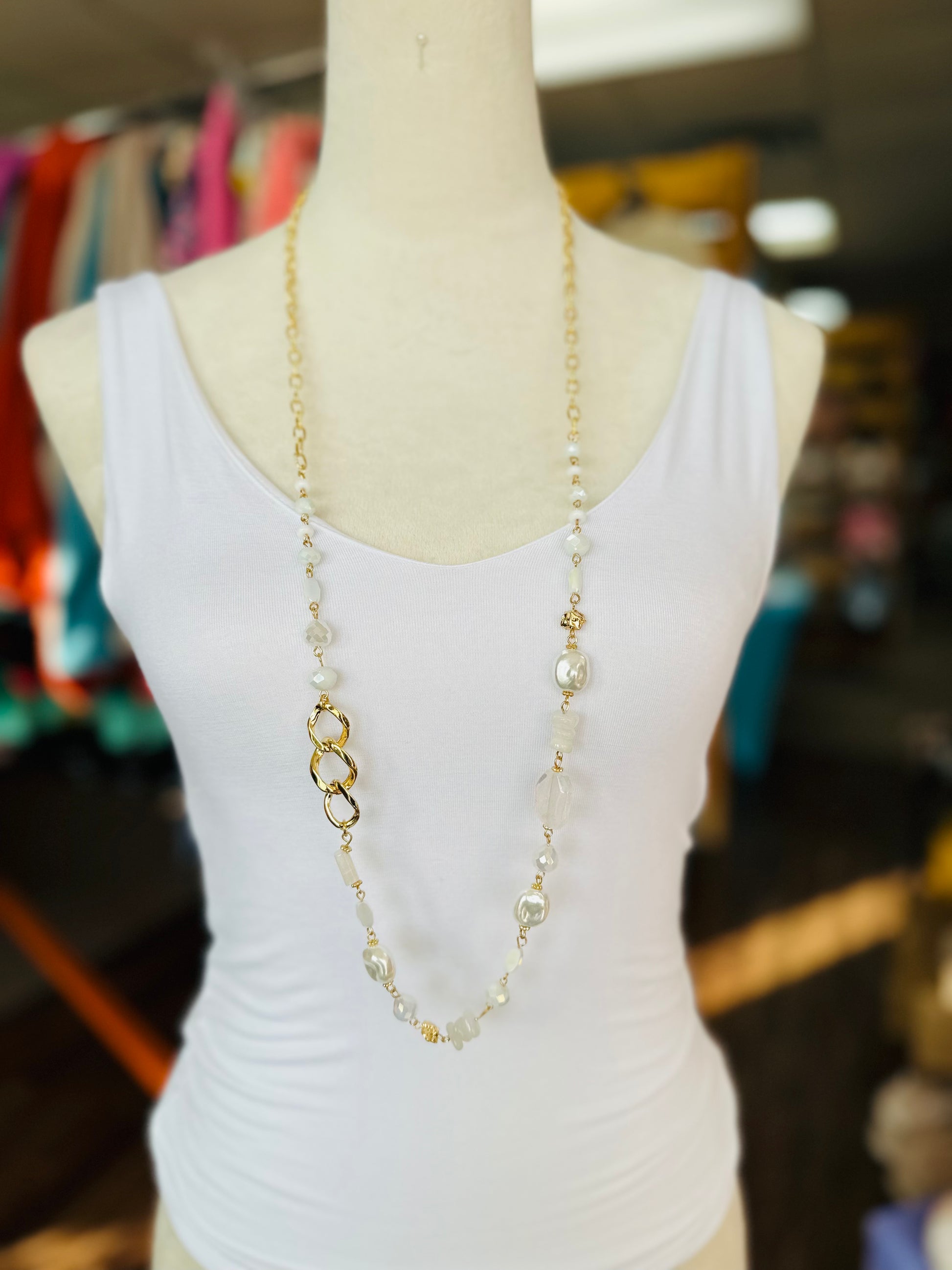 KK Gold and White Stone and Pearl Long Beaded Necklace